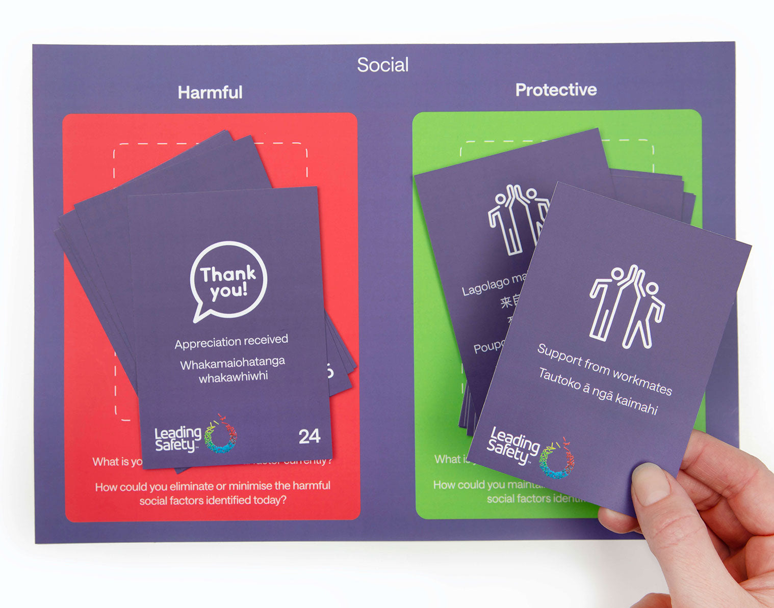 The cards reflect 36 common work-related factors identified in ISO 45003 (the international framework for managing psychosocial factors) that can either harm or protect a worker’s wellbeing.